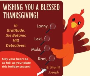Please tune in at 5 p.m., PT, for this fun, fast-paced question-and-answer format event! I will be talking about my Botanic Hill Detectives Mysteries, Books 1-5, and introducing Book 6, which releases this fall.