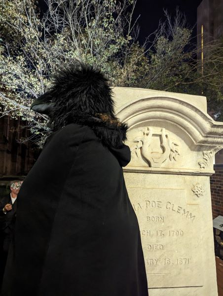 PoeBlackCatBallWayneAtGraveAsRaven